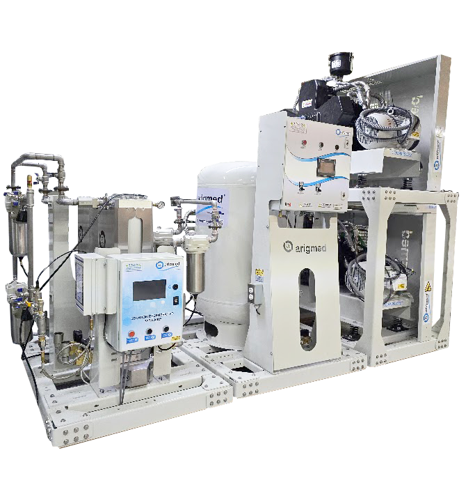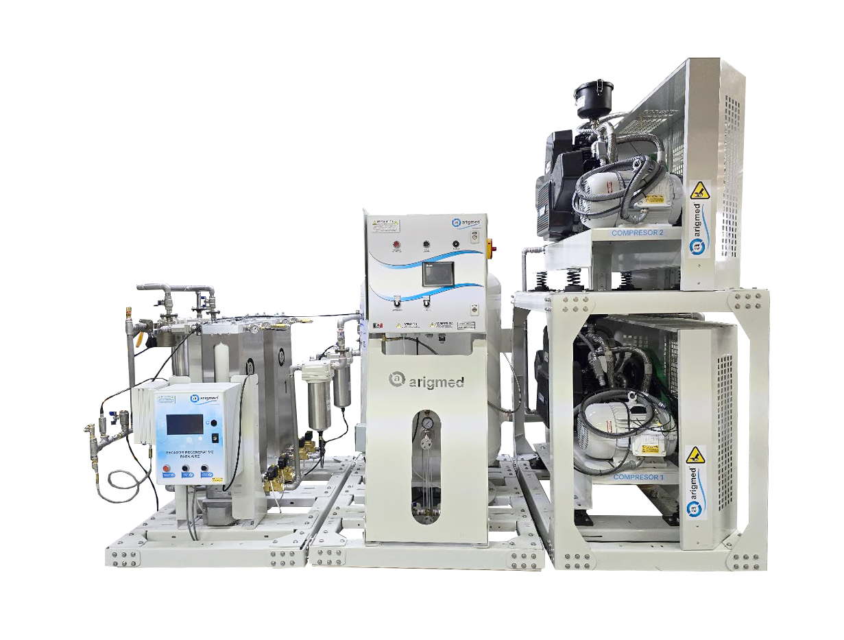 Sistema de Produção de Ar para Instrumentos, de pistão alternativo Marca Arigmed com certificação ISO 8573-1:2010, em conformidade com a NFPA99 e outros Códigos.